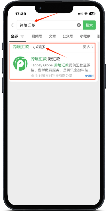 第一步:在微信中搜索框中搜索“跨境汇款”,点击进入跨境汇款(微汇款)小程序