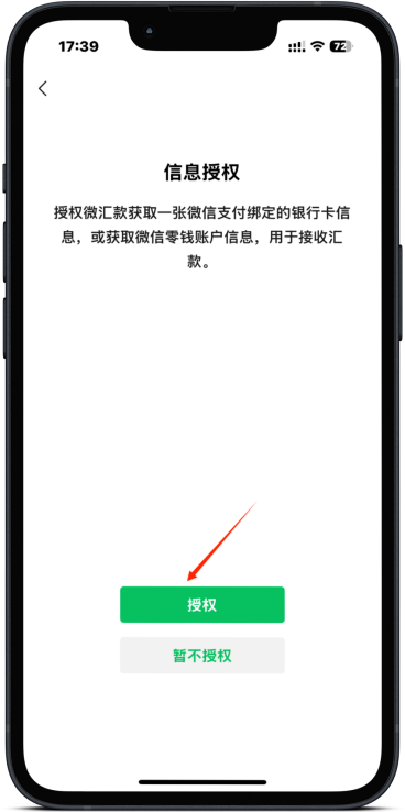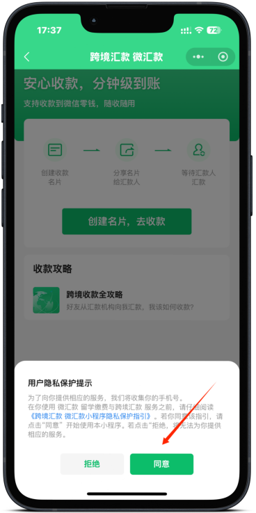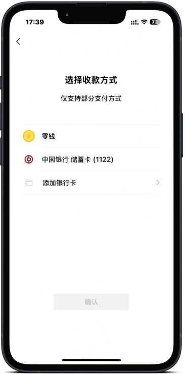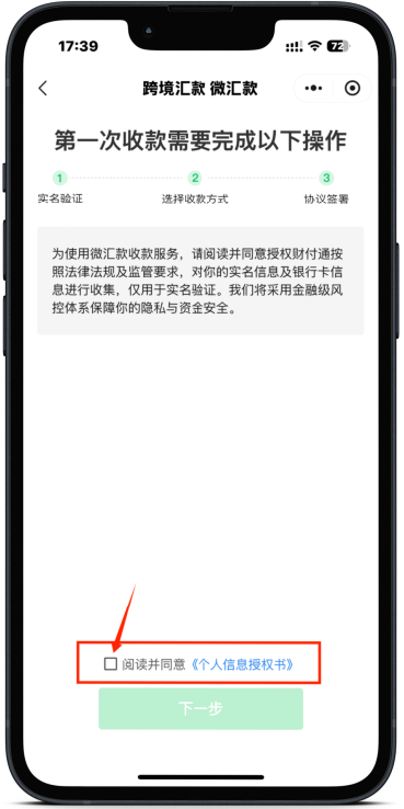 第四步:同意实名验证信息授权选择收款方式,支持微信零钱/银行卡收款(零钱收款单笔最高金额不可超过30000人民币,大于30000人民币需要选择银行卡收款哦)