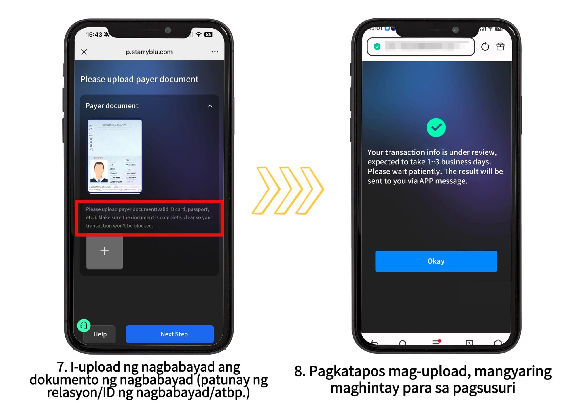 *Kung ito ang unang pagkakataon na magbabayad ang taong ito sa iyong Starryblu account, mangyaring mag-upload ng dokumento. Kapag nakapasa ito sa pagsusuri, awtomatikong gagawin ang mga transaksyon mula sa parehong tao sa hinaharap.
