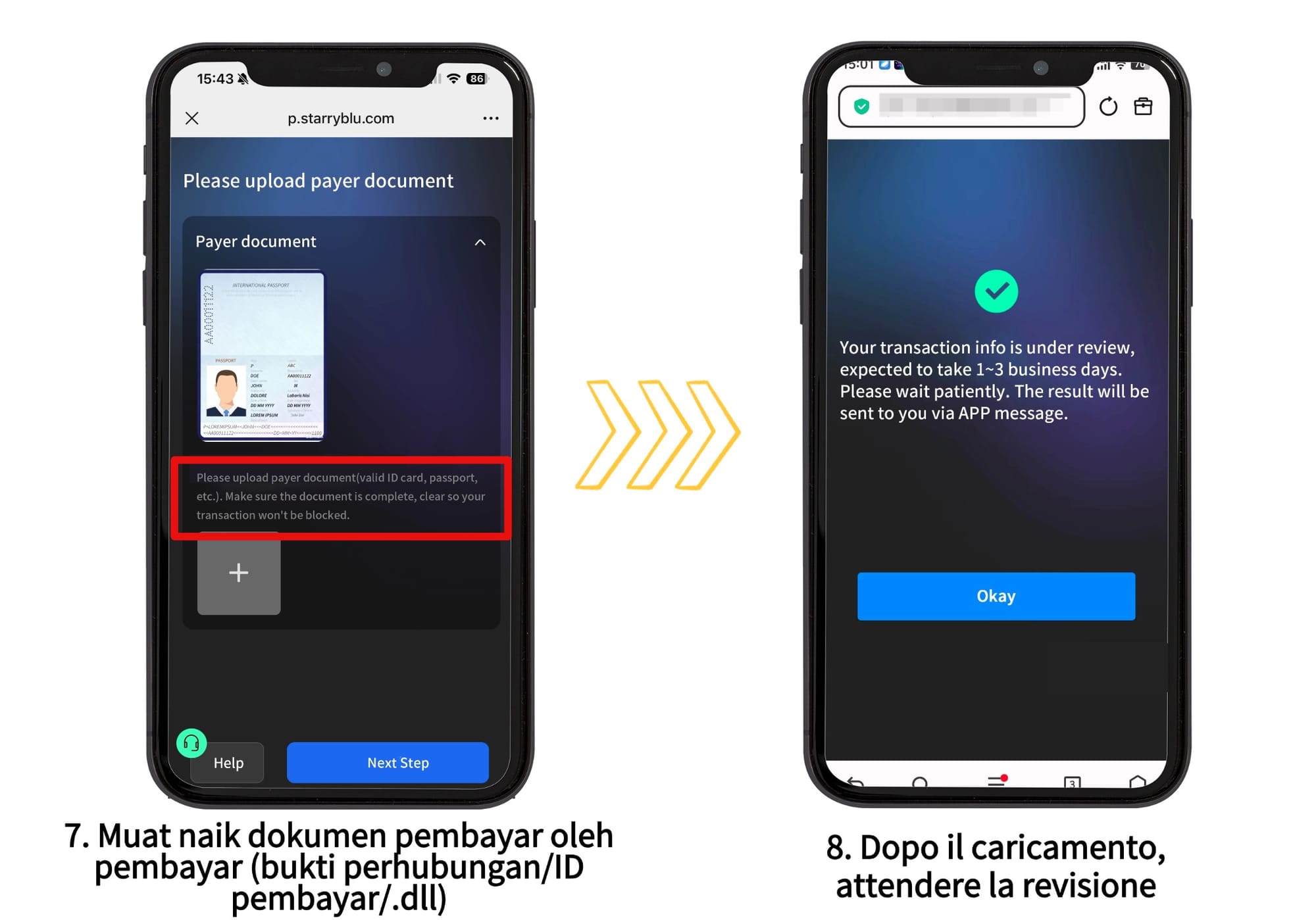 *Jika ini kali pertama orang ini membayar ke akaun Starryblu anda, sila muat naik dokumen. Sebaik sahaja ia lulus semakan, transaksi daripada orang yang sama pada masa hadapan akan dilakukan secara automatik.
