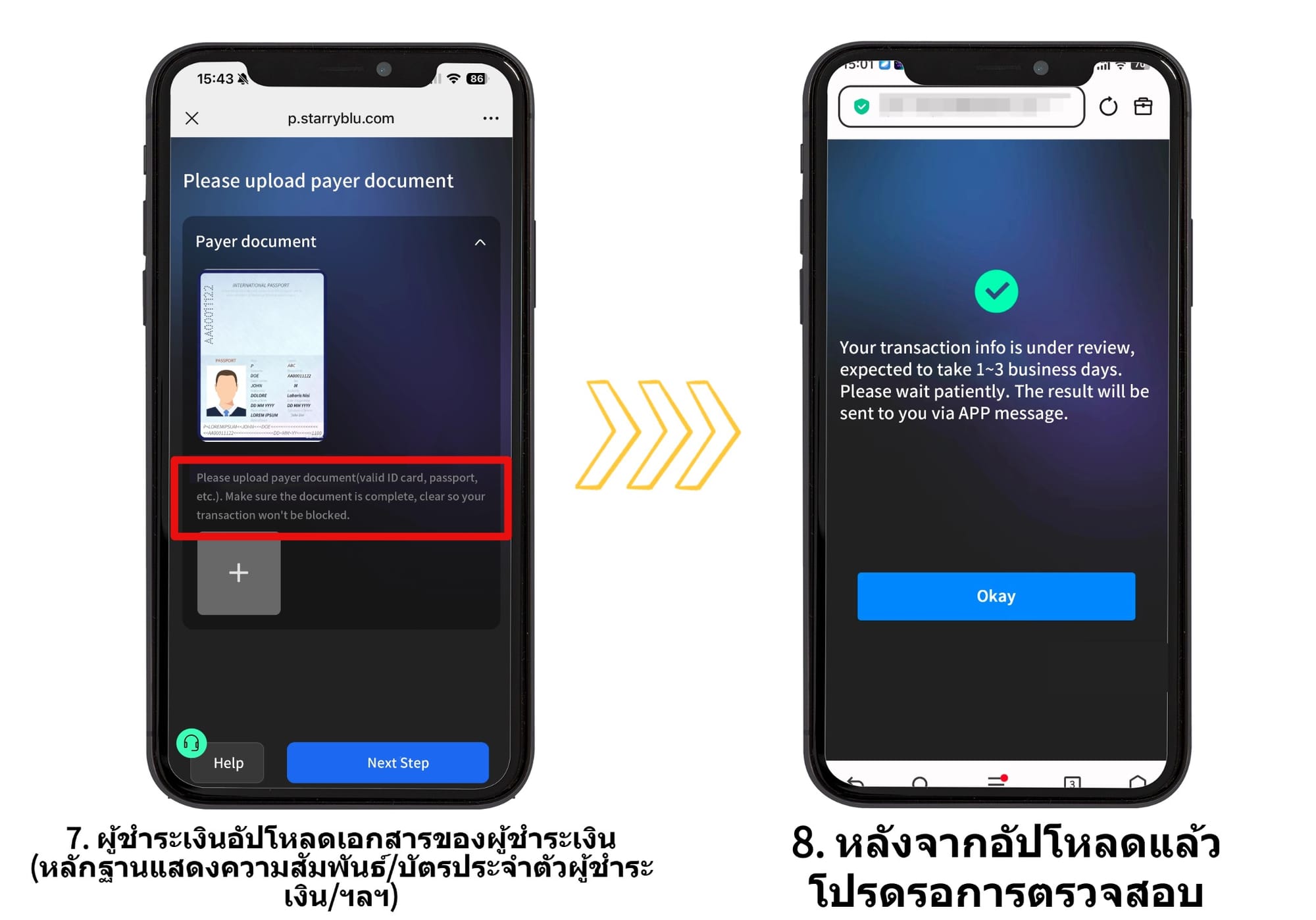หากนี่เป็นการชำระเงินครั้งแรกของบุคคลนี้เข้าบัญชี Starryblu ของคุณ โปรดอัปโหลดเอกสาร เมื่อเอกสารผ่านการตรวจสอบแล้ว การทำธุรกรรมจากบุคคลเดียวกันในอนาคตจะดำเนินการโดยอัตโนมัติ